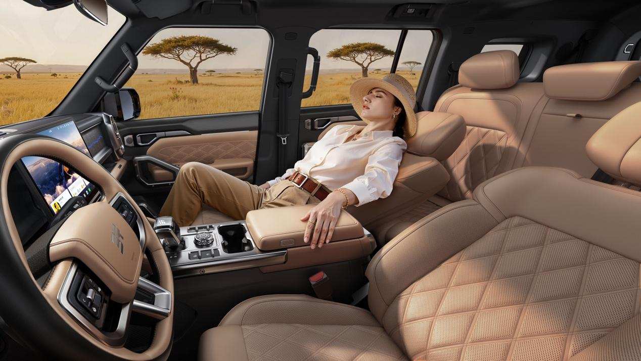 值得注意的是,该车支持2.2kW+6.6kW内外放电功能,能够满足露营、野餐等户外场景的用电需求,贴合当下流行的户外出行趋势。底盘7块钢制护板的设计,可保护电池包免受刮蹭,坦克转向功能则让车辆转弯半径低至4.785米,提升了狭窄路段的通行灵活性。