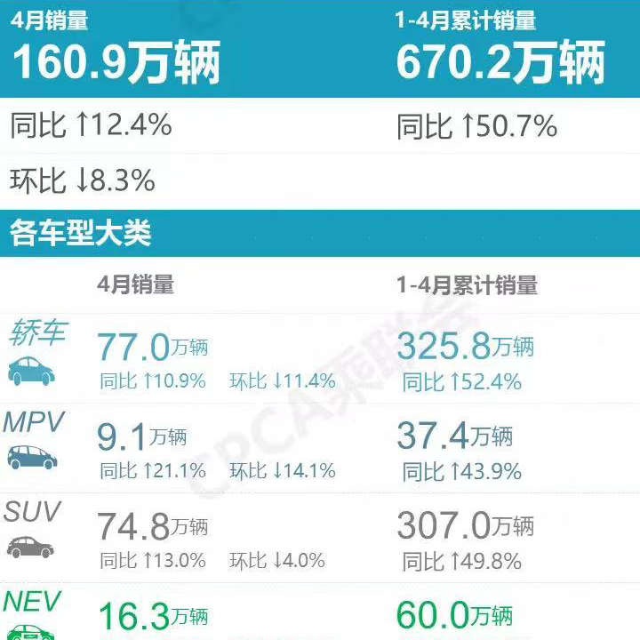 我们先来看下乘联会最新的机动车零售销量统计,4月份国内狭义乘用车市场销量就是上图了。虽说整个乘用车市场销量环比下降了8.3%,新能源市场环比3月销量下降12%,但4月销量环比下降其实不足为奇,原因是每年第一季度包含着我们最重要的节日——春节,而过了年之后一般会释放春节这段时间积累的消费需求,因此3月会是汽车市场销量的小高峰,4月销量相对来说会回归平缓。