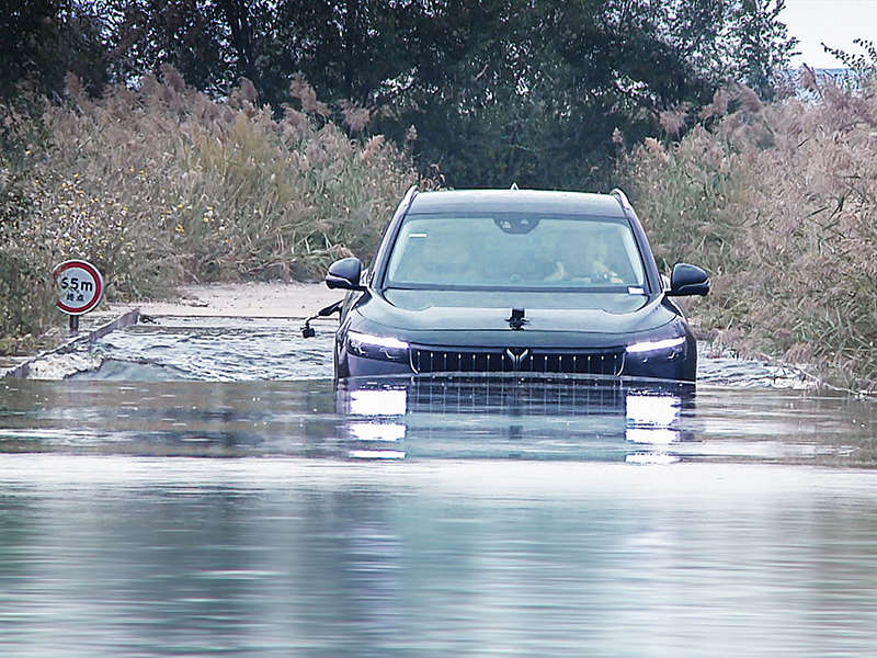 参与测试的车辆为岚图FREE纯电版与增程版,水深为600mm,从图中可以看到水已经到达前格栅三分之二处,值得注意的是,增程版车型是在开启纯电模式后通过测试。
