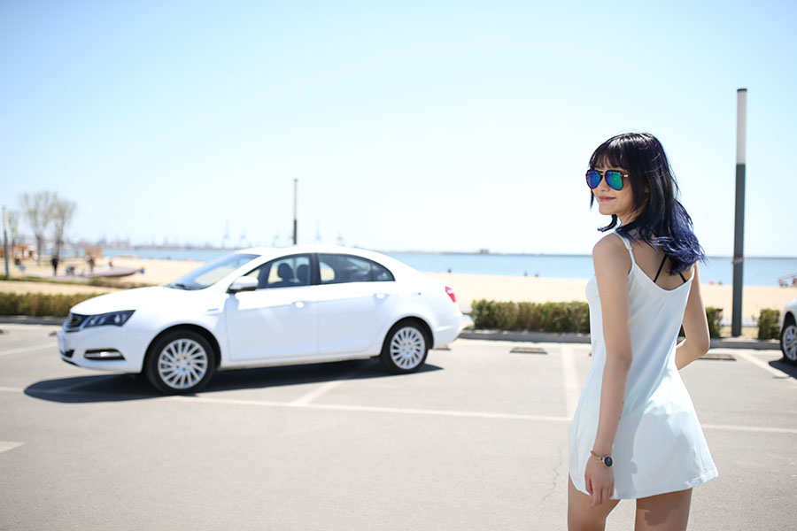 三位小编与美女车模分别乘坐帝豪EV新老两款车(一位男小编和女小编乘坐老款帝豪EV,该车为租赁车,租赁时已行驶7512km,行驶时间大概3个月以上。其中一位男小编和美女车模乘坐新款帝豪EV300)。